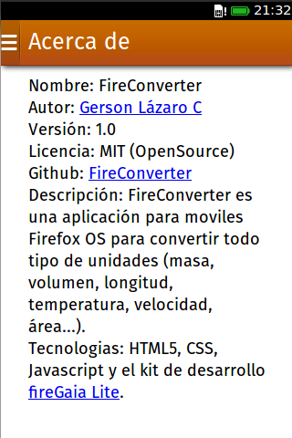 Realiza tus conversiones en un 2x3 con Fire Converter! ¿Cuantos centímetros son 30 millas? ¿Cuantos grados centigrados son 35 kelvin? ¿Cuantas millas por segundo son 20 km/h? Esas y muchas mas conversiones entre diversas unidades podrás realizarlas con Fire Converter, sin costo y sin necesidad de conexión a la red.
