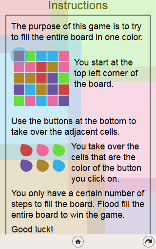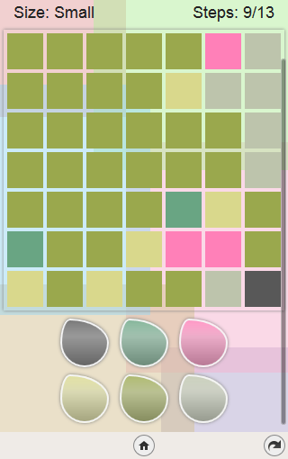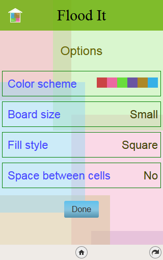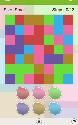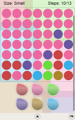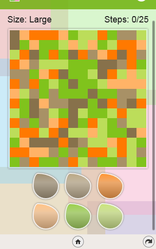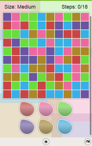 Flood It is an addictive color filling strategy game. The purpose of this game is to try to flood fill the entire board in one color. You start at the top left corner of the board. This is your initial area. In each step, you fill a different color in your current area using the buttons at the bottom. You take over the adjacent cells that are the color you fill. By taking over the cells of different colors in each step you increase your area and try to take over the entire board. This is what we call flood filling. You only have a certain number of steps to fill the board. Flood fill the entire board to win the game. Game options: 1. Four color schemes 2. Five board sizes 3. Two fill styles (squares and circles) 4. An option to have some space between the cells (if it makes the board look better for you that way) Try different combinations of the above options to have a more enjoyable experience.