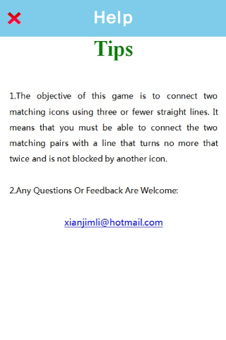 This application is a fun puzzle game to practice reaction speed, remembrance, resilience. It is easy to play, and it is good for any ages. The objective of this simple game is to connect two matching icons using three or fewer straight lines. It means that you must be able to connect the two matching pairs with a line that turns no more that twice and is not blocked by another icon.