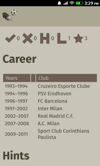 Football quiz Find out the player from a career. Two game modes: 1. Levels: you need 4 correct answers to complete the level. 2. Random: players are picked randomly. 5 correct answers in a row give you an extra life. This is a beta version, please post your suggestions in the comments.
