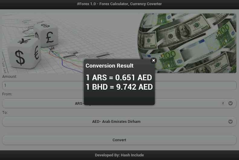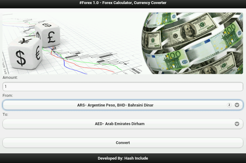 Forex Calculator, Currency Coverter is used for exchanged currency values. It uses current exchange rates. You select the currencies to be converted, converted it to the other currency using current exchange rates. The application uses internet to fetch the current values. Simple UI are used.