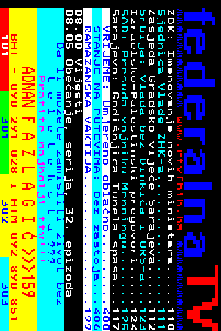 Teletext of Bosnian Federal Television - FTV (Federalna TV) Use the buttons to navigate through the teletext, +1 - next page, -1 previous page, +/1 for next subpage, -/1 for previous subpage, or jump directly to a desired page. Fast and easy to use.