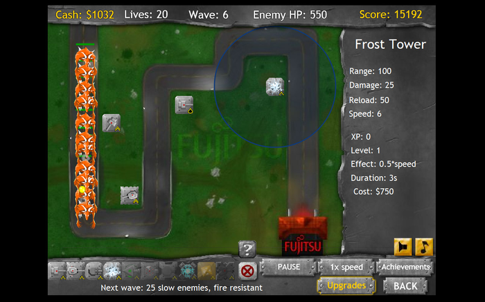 Tower defense game based on levelling your tower. Tower defense game based on leveling your tower. Lots of towers, enemies, achievements and upgrades.Balanced game with very wide range of game strategies Remember that every tower level up during the game, so build enough of them.Golden Tower gives you cash for every shot.Shock tower is very good in stopping single enemy.Frost tower stops groups very good.Flame tower is ultimate weapon.