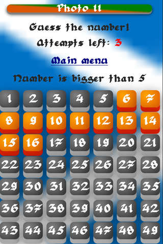 Discover 21 beautiful images of wonderful Scotland landscape (from our 2013 vacation). Simple game a'la gallery for your Firefox OS. Landscape mode is recommended for larger photos, although portrait mode is supported as well... You've 5 attempts to guess number in between 1-49, while all lower or upper numbers are automatically disabled before your next try.