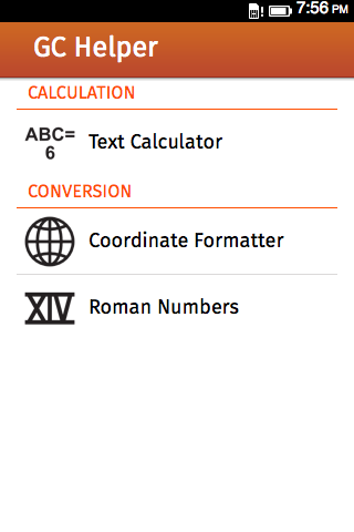 Helping geocachers solve multi or puzzle caches. For this, GCHelper (also known as Geocaching Helper) provides functionality like: - Text Calculator (character count, calculate value sums, digit sums, …) - Convert coordinates (Degrees, Minutes, Seconds; Degree, Decimal Minutes; Decimal Degrees) - Roman numbers We'll add more features in the future: - Text cryptography: convert from and to ROT-X, Vigenere cipher, … - Morse code: translate from or to morse code - And more ;)