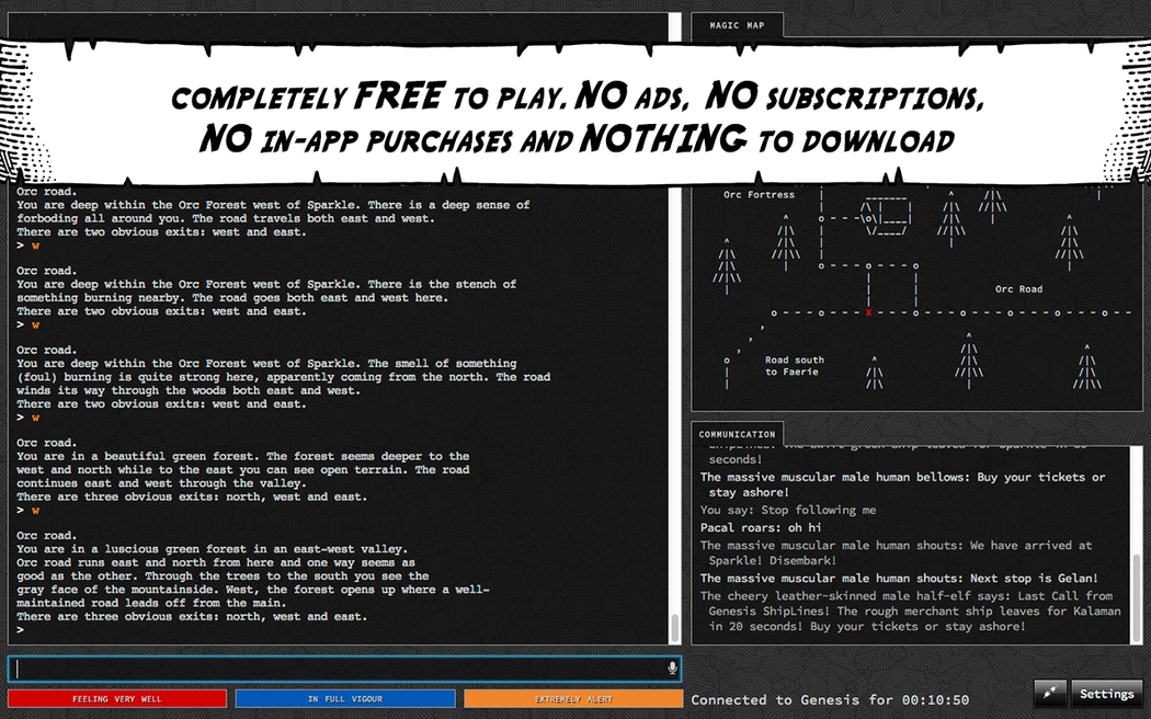 Genesis is one of the oldest and best fantasy-roleplaying games of all time. For 25 years, it has been home to players from all around the world. Play as one of over 10 different races and sub-races, determining the story behind who you are, and who you will choose to become. Explore by adventuring in over 20 realms, many of which have been inspired by popular settings from fantasy literature and others which are unique originals. Complete hundreds of hand-crafted and thematic quests scattered throughout the game, many of which reward riches and powerful items to those who prevail against their mysteries.