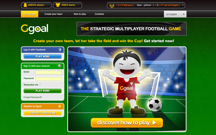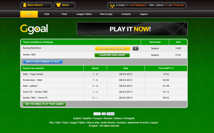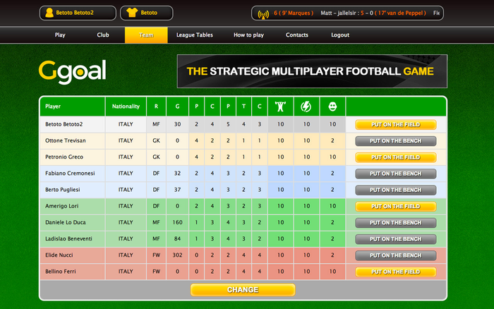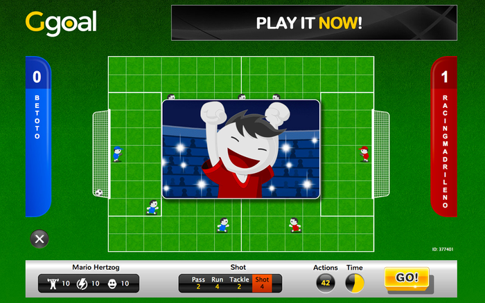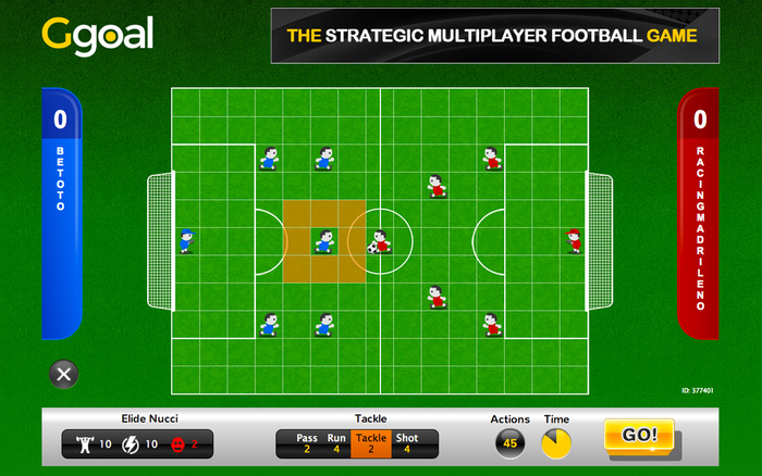 The multiplayer football chessboard for those who love strategic games. Play GGOAL now with other friends around the world. You have the complete control of the players, you are a couch, you are a player and you are a GGOALer! The football / soccer game Ggoal is the premier online Browser Game. It offers a great Football chessboard and online multiplayer. Ggoal is a Tactic/Strategic browser game where different players can have a real challenge in a Football Chessboard. With Ggoal you'll be, at the same time, the president, manager, coach and player of your football team! You'll be able to play exciting and challenging matches against your friends all over the world in real time. The main feature of Ggoal is the appropriate management of the on-field players. It is possible to move your own players, to make them run, to make them pass the ball or carry out some tackles and naturally to make them kick and score a goal! The game is a multiplayer one and the user has a team made up by himself/herself and other 5 players that he/she can move. Therefore, the user is at the same time a player and the trainer. Ggoal is a new, user-friendly and original browser game! and ... It's free! PLAY NOW ! www.ggoal.com