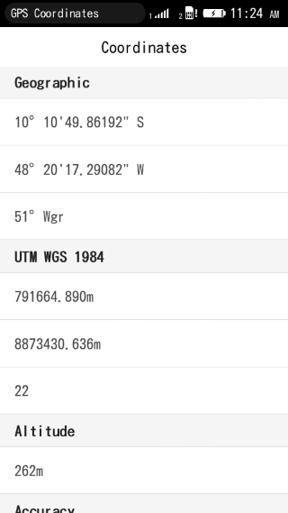 This app shows a complete information about your location, like Geographics Coordinates (latitude and longitude), also convert it to plain UTM Coordinate (East and North in meters). Other information that you can obtain is: Central Meridian, UTM Zone, Altitude and the current location accuracy.