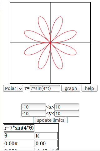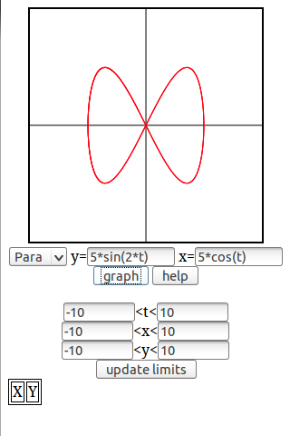 This version includes an algebra expression to JS expression translator. This means the user may enter an expression such as 2sin(x)^3 and this will be translated to the JS expression: 2*Math.pow(Math.sin(x), 3). The engine includes error checking and can identify syntax errors and unbalanced parentheses. However, due to the translator's design stray lower-case letters will be identified as variables. Such as in the expression glog(x), 'g' would be assumed to be a second variable because it is not part of a known function name. This is not a problem for the translator, but it does cause errors in the main graphing loop which does not recognize the unintentional letter. The help page displays what variable names are to be used with each graphing mode: x with Rect, t with Para, t with Polar.