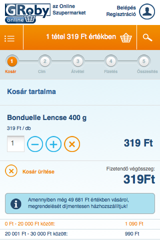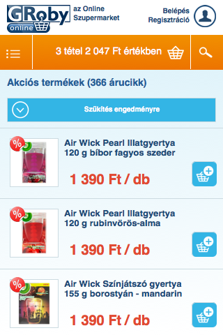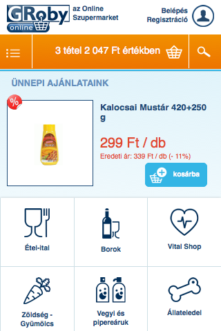 The mobile application of G'Roby Online Supermarket provides you the experience of the most sophisticated shopping. You can select from more than six thousand kinds of food and household goods and your order can be delivered within 24 hours. We deliver your order to the whole territory of Hungary. The perishable, easy to melt, frozen and bakery products can be delivered to Budapest and Pest County. You can pay in cash after the receipt of the goods or you can choose electronic payment methods. Try our shop! The G'Roby has been working for the customers for 20 years!