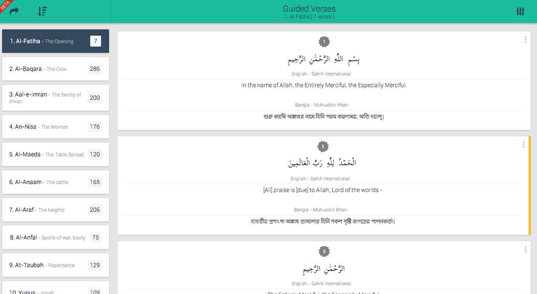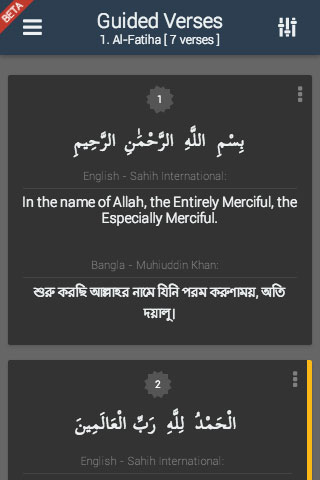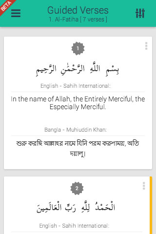 Guided Verses - An immersive Qur'an experience for web and mobile ----- we are launching in BETA state and we want your feedback to improve our upcoming releases ----- We aim to provide you with an easy reading experience and a resourceful understanding experience of the verses of the noble Qur'an. We aim to do that with support for multi-lingual translations of the verses from the Quran, so that understanding the Quran is as much native to you as you desire. We aim to do that with accompanied Hadith and commentaries on the Quranic verses which provide greater clarity of context on the revelations of the Quran. We aim to do that by providing you with a diverse (yet easy) set of options & configurations with which you can enjoy a highly customizable reading experience of the Quran. We aim to do that by utilizing the latest technologies of the internet in the desktop and mobile space - so that being "on the go" is never an excuse to stop learning the Quran. We aim to provide all of that to you - for free. Yup! It's free. Visit http://www.GuidedVerses.com/ for more information on our mobile apps and web apps Follow our official Facebook Page at: https://www.facebook.com/GuidedVerses Follow our official Google+ Page at: https://plus.google.com/u/0/118419744131632592952/about Join the Android BETA tester program [would be rough and buggy] at: https://plus.google.com/u/0/communities/104463247552913367852 tags: guided , verses , quran , qur'an , kuran , koran , android , easy , beautiful , geeks , immersive , religion , islam , bangla , english , translation , ayat , ayah , light , bible