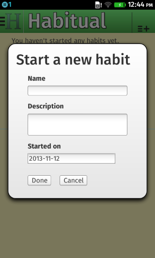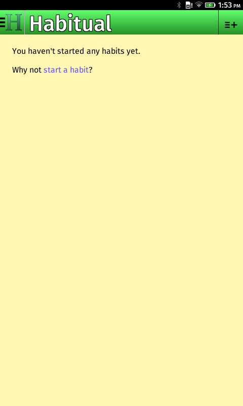 Track your progress on building good habits. Add habits you want to establish and then check in each day to see how you're doing. Habitual keeps track of how many days in a row you've continued your new habit, providing daily motivation. Get badges for habits that you've kept for a long time. What's New? November 12, 2013