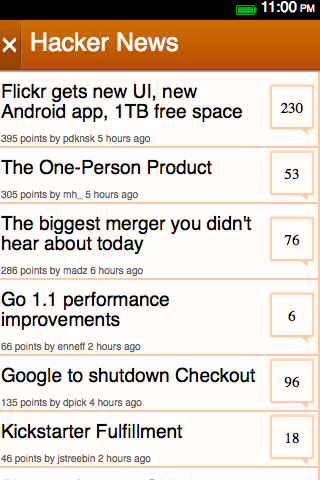Open-Source Hacker News Reader Built for Firefox OS. Hacker News Reader This is an application for viewing Hacker News from Y combinator. It supports basic article and comment reading. This application is also open-source! The code can be found here: https://github.com/WhiteDawn/HackerNews