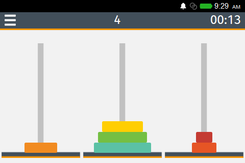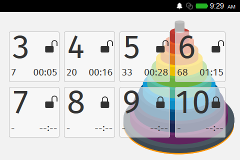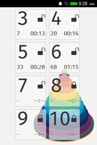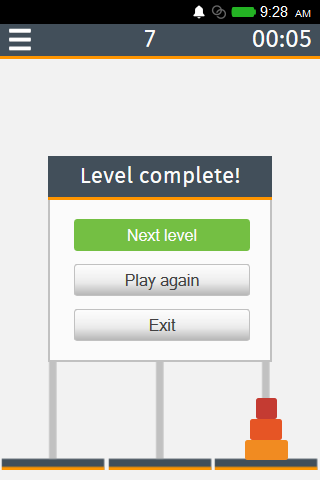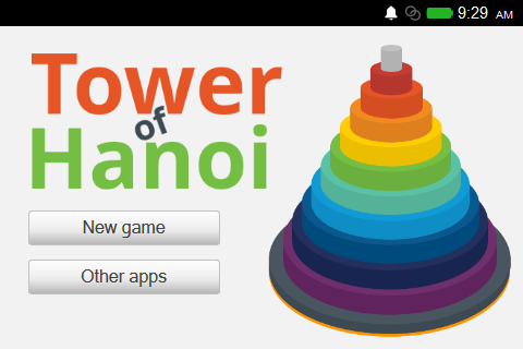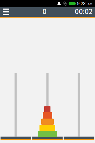 Tower of Hanoi is a simple puzzle involving a transfer all the elements to another tower. The level is completed when all the elements are on another tower in the correct order. When moving items can not be put higher on the smaller element. The game has 8 different levels of difficulty, from 3 to 10 parts of the tower. After completing a level is unlocked next.