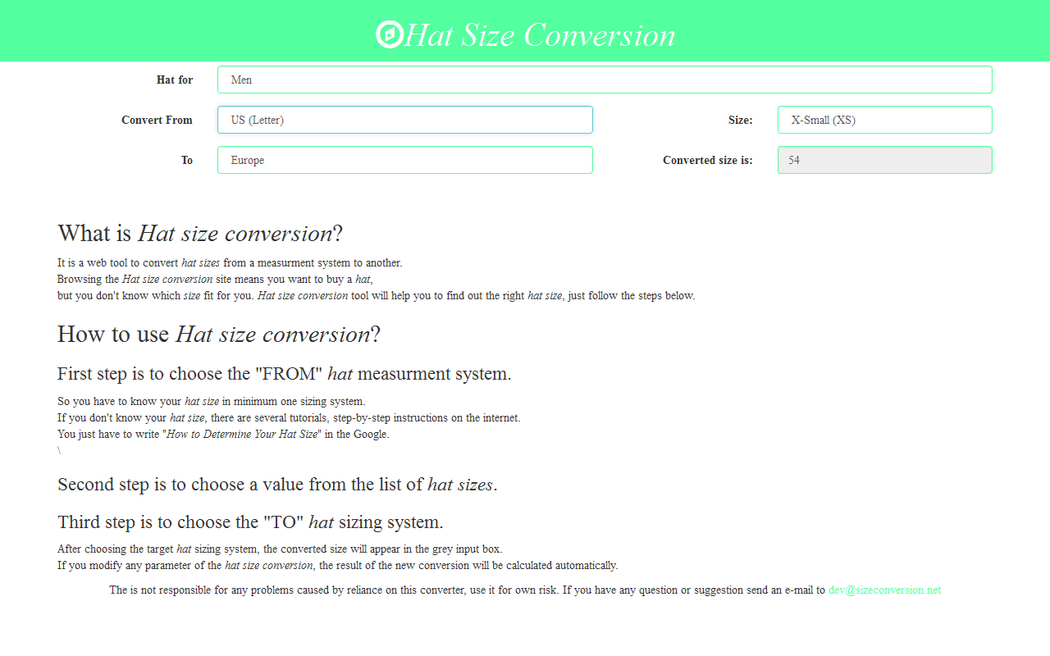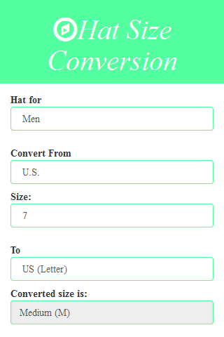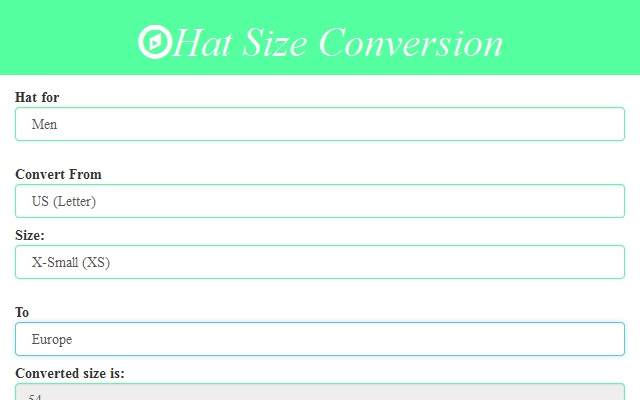 Hat Size Conversion is a web tool to convert hat sizes between different sizing systems. It is very user friendly, just modify the converter's parameters and the conversion is executed instantly