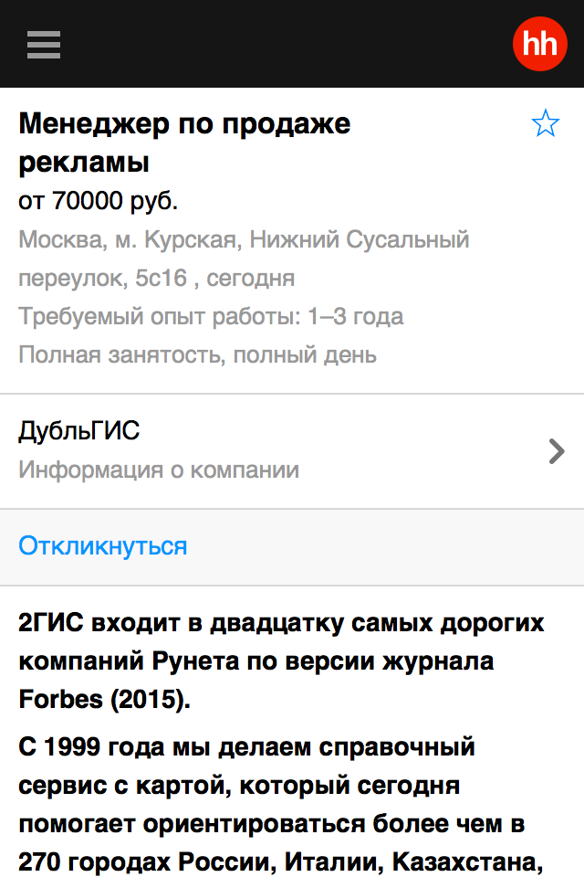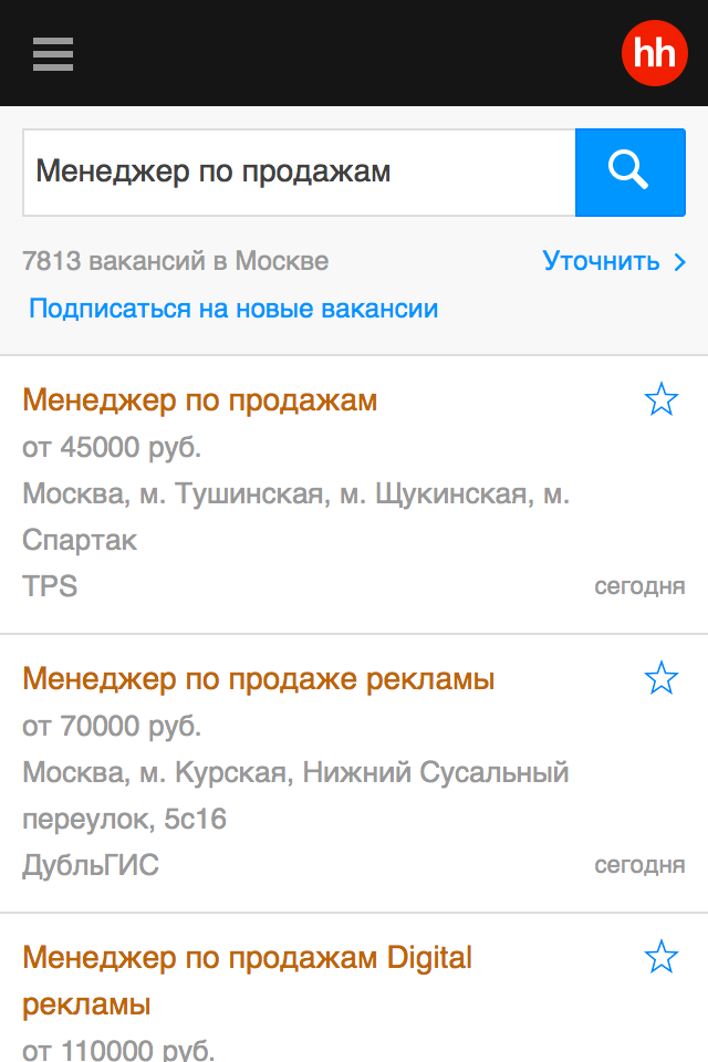 Официальное мобильное приложение HeadHunter для поиска работы позволит Вам не упускать интересные вакансии и откликаться на них в любое удобное для вас время. С помощью приложения вы сможете: - пользоваться поиском вакансий; - просматривать описание вакансий и страницы компаний; - откликаться на вакансии; - войти в свой личный кабинет или зарегистрироваться на сервисе HeadHunter; - просматривать свое резюме; - и многое другое. Работа мечты в вашем кармане!