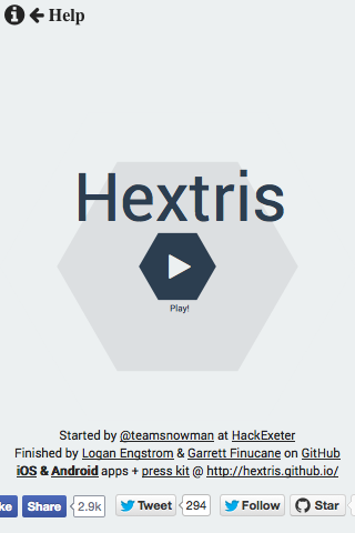 HEXTRIS is a fast paced puzzle game inspired by Tetris. Blocks start on the edges of the screen, and fall towards the inner blue hexagon. The objective of the game is to prevent the blocks from stacking outside the area of the grey hexagon. To do this, you must rotate the hexagon to manage different stacks of blocks on each face. Aim to connect 3 or more blocks of the same color: when 3 or more blocks of the same color touch each other, they are destroyed, and the blocks above them slide down! Destroying multiple series of blocks grants combos, whose durations are indicated by a quickly receding outline around the outer, grey hexagon. You lose once blocks on a face of the hexagon stack outside of the outer hexagon! Built by @teamsnowman (@meadowstream, @garrettdreyfus, @nmoroze, and @themichaelyang) for HackExeter 2014. Github source : http://github.com/hextris/hextris