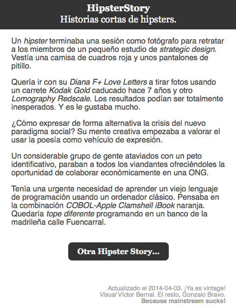 Aplicación web que genera historias breves aleatorias sobre Hipsters. Perfecto pra breves momentos de lecturas. Tal vez inspiradoras.