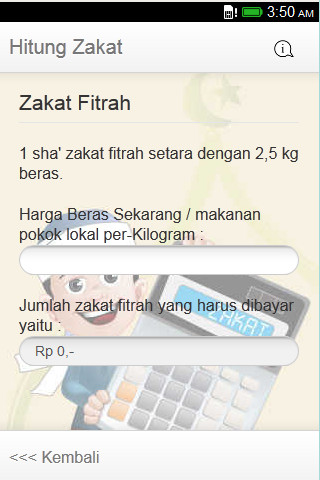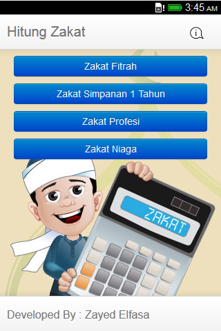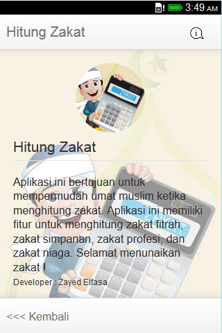 English : Hitung Zakat is an application that aims to facilities Muslims in calculating zakat. Indonesian : Hitung Zakat merupakan aplikasi yang bertujuan untuk mempermudah umat muslim dalam menghitung zakat. Aplikasi ini memiliki fitur untuk menghitung zakat fitrah, zakat simpanan, zakat profesi, dan zakat niaga.