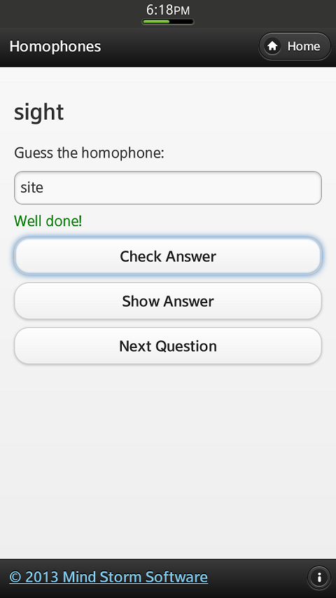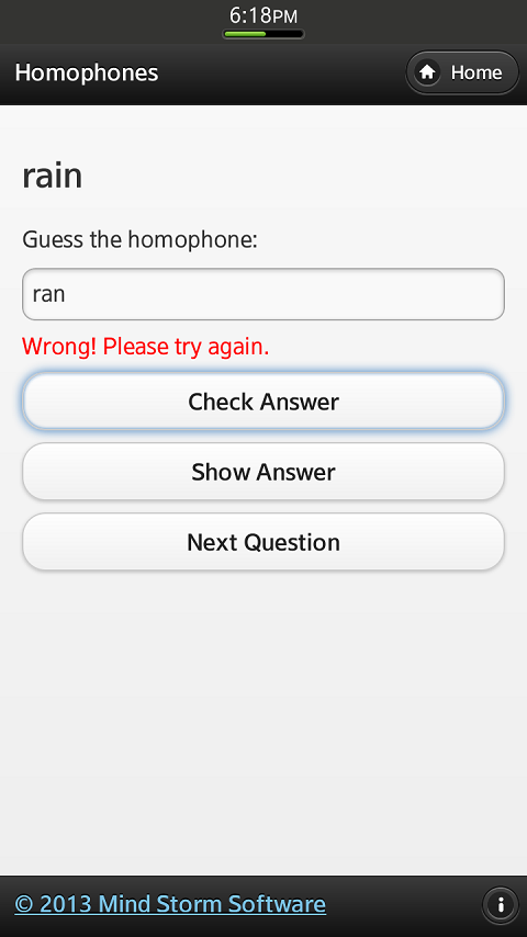 Fun With Homophones is an application that helps you build your English vocabulary via similar sounding words. The aim of the application is to guess a correct English word that rhymes/sounds exactly the same.