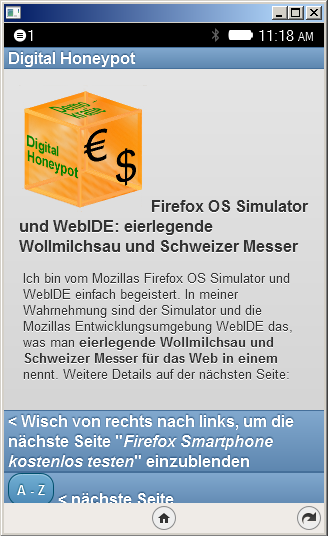 Firefox OS Simulator und WebIDE: eierlegende Wollmilchsau und Schweizer Messer in einem. Eine Lobeshymne an Produkte und Konzepte der Mozilla Foundation für Anfänger, die keine Erfahrung mit Webapps haben. Die Honeypot-App selbst dient als Beispiel, um schnell zu eigener App zu kommen. Die App ist unter anderem dafür gedacht, um weitere Entwickler für die Mozilla-Produkte und Konzepte zu gewinnen, enthält weiterführende Verweise auf die Quellen auf https://developer.mozilla.org und wird nach und nach ausgebaut - parallel zu den Lernfortschritten des Autors und zur Weilerentwicklung von Mozillas Produkten und Konzepten.