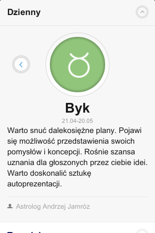 Chcesz poznać swoją przyszłość? Pobierz aplikację HOROSKOP od INTERIA.PL. Poznasz odpowiedzi na nurtujące Cię pytania. Kiedy spotkasz miłość swego życia? Powie Ci to horoskop. Czy warto już teraz planować nowe przedsięwzięcia? I czy sprzyjają Ci gwiazdy? To wszystko powie Ci aplikacja Horoskop od INTERIA.PL. Codziennie, dla INTERIA.PL, najlepsze wróżki i wróże przygotowują dziesiątki horoskopów. Wśród nich znajdziesz horoskop dzienny, horoskop erotyczny i horoskop chiński. W aplikacji znajdziesz horoskopy: codzienny, tygodniowy, miesięczny, roczny, miłosny, erotyczny, majów, kwiatowy, drzewny, numerologia.