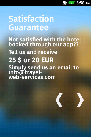 Book your Hotel through your favorite Portal like booking com and Expedia with our satisfaction Guarantee. What do you get? Money back if not satisfied. Not the entire amount, but more than a consolation prize. If, your hotel turns out to be a disappointment you will receive reimbursement of minimum 20 EUR or $20. How does it work? It's actually pretty simple. For every booking that is generated through our app we receive 2-3% commission from each Hotel Portal. That may not sound like very much per booking, but the key is in the quantity of bookings and that sure adds up fast :-) We combine all the money in one collective pot, which we use to pay your reimbursement. It's similar to Insurance with one small but very important difference, that no one needs to make a deposit. One email to us is all it takes! Info Even though all Portals want you to believe they charge you no Facilitator fee....They still do so! In the end the Hotel has to pay 10-25% to the Facilitator. Our savvy common sense already tells us that Portals have to survive and profit from something!