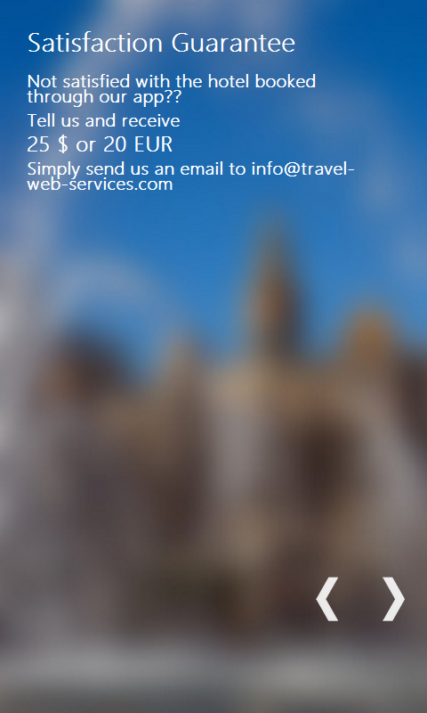 Book your Hotel through your favorite Portal like booking .com and Expedia with our satisfaction Guarantee. What do you get? Money back if not satisfied. Not the entire amount, but more than a consolation prize. If, your hotel turns out to be a disappointment you will receive reimbursement of minimum 20 EUR or $20. How does it work? It's actually pretty simple. For every booking that is generated through our app we receive 2-3% commission from each Hotel Portal. That may not sound like very much per booking, but the key is in the quantity of bookings and that sure adds up fast :-) We combine all the money in one collective pot, which we use to pay your reimbursement. It's similar to Insurance with one small but very important difference, that no one needs to make a deposit. One email to us is all it takes! Info Even though all Portals want you to believe they charge you no Facilitator fee....They still do so! In the end the Hotel has to pay 10-25% to the Facilitator. Our savvy common sense already tells us that Portals have to survive and profit from something!