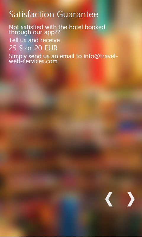 Book your Hotel through your favorite Portal like booking .com and Expedia with our satisfaction Guarantee. What do you get? Money back if not satisfied. Not the entire amount, but more than a consolation prize. If, your hotel turns out to be a disappointment you will receive reimbursement of minimum 20 EUR or $20. How does it work? It's actually pretty simple. For every booking that is generated through our app we receive 2-3% commission from each Hotel Portal. That may not sound like very much per booking, but the key is in the quantity of bookings and that sure adds up fast :-) We combine all the money in one collective pot, which we use to pay your reimbursement. It's similar to Insurance with one small but very important difference, that no one needs to make a deposit. One email to us is all it takes! Info Even though all Portals want you to believe they charge you no Facilitator fee....They still do so! In the end the Hotel has to pay 10-25% to the Facilitator. Our savvy common sense already tells us that Portals have to survive and profit from something!