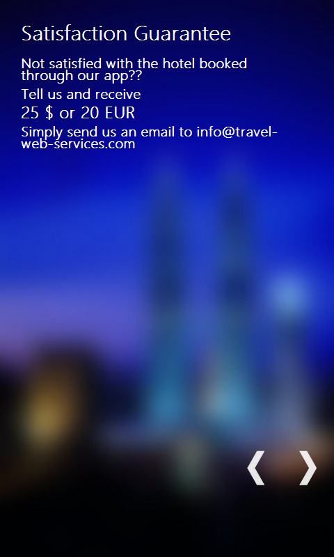 Book your Hotel through your favorite Portal like booking .com and Expedia with our satisfaction Guarantee. What do you get? Money back if not satisfied. Not the entire amount, but more than a consolation prize. If, your hotel turns out to be a disappointment you will receive reimbursement of minimum 20 EUR or $20. How does it work? It's actually pretty simple. For every booking that is generated through our app we receive 2-3% commission from each Hotel Portal. That may not sound like very much per booking, but the key is in the quantity of bookings and that sure adds up fast :-) We combine all the money in one collective pot, which we use to pay your reimbursement. It's similar to Insurance with one small but very important difference, that no one needs to make a deposit. One email to us is all it takes! Info Even though all Portals want you to believe they charge you no Facilitator fee....They still do so! In the end the Hotel has to pay 10-25% to the Facilitator. Our savvy common sense already tells us that Portals have to survive and profit from something!