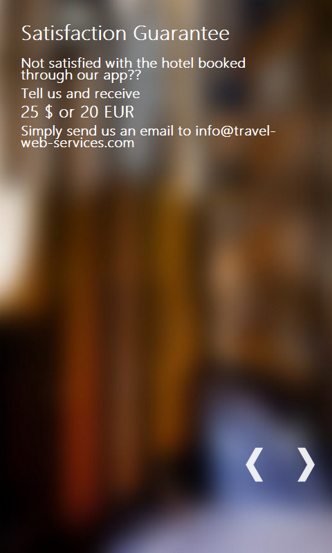 Book your Hotel through your favorite Portal like booking .com and Expedia with our satisfaction Guarantee. What do you get? Money back if not satisfied. Not the entire amount, but more than a consolation prize. If, your hotel turns out to be a disappointment you will receive reimbursement of minimum 20 EUR or $20. How does it work? It's actually pretty simple. For every booking that is generated through our app we receive 2-3% commission from each Hotel Portal. That may not sound like very much per booking, but the key is in the quantity of bookings and that sure adds up fast :-) We combine all the money in one collective pot, which we use to pay your reimbursement. It's similar to Insurance with one small but very important difference, that no one needs to make a deposit. One email to us is all it takes! Info Even though all Portals want you to believe they charge you no Facilitator fee....They still do so! In the end the Hotel has to pay 10-25% to the Facilitator. Our savvy common sense already tells us that Portals have to survive and profit from something!