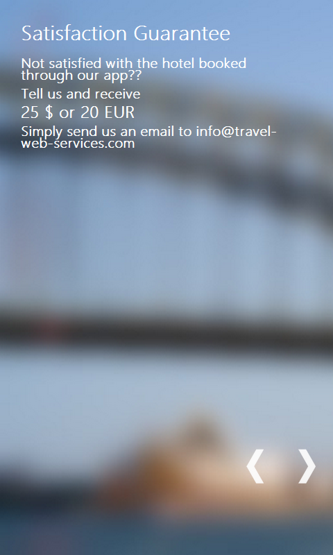 Book your Hotel through your favorite Portal like booking .com and Expedia with our satisfaction Guarantee. What do you get? Money back if not satisfied. Not the entire amount, but more than a consolation prize. If, your hotel turns out to be a disappointment you will receive reimbursement of minimum 20 EUR or $20. How does it work? It's actually pretty simple. For every booking that is generated through our app we receive 2-3% commission from each Hotel Portal. That may not sound like very much per booking, but the key is in the quantity of bookings and that sure adds up fast :-) We combine all the money in one collective pot, which we use to pay your reimbursement. It's similar to Insurance with one small but very important difference, that no one needs to make a deposit. One email to us is all it takes! Info Even though all Portals want you to believe they charge you no Facilitator fee....They still do so! In the end the Hotel has to pay 10-25% to the Facilitator. Our savvy common sense already tells us that Portals have to survive and profit from something!