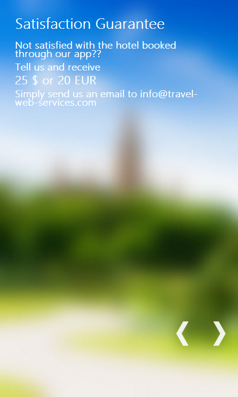 Book your Hotel through your favorite Portal like booking .com and Expedia with our satisfaction Guarantee. What do you get? Money back if not satisfied. Not the entire amount, but more than a consolation prize. If, your hotel turns out to be a disappointment you will receive reimbursement of minimum 20 EUR or $20. How does it work? It's actually pretty simple. For every booking that is generated through our app we receive 2-3% commission from each Hotel Portal. That may not sound like very much per booking, but the key is in the quantity of bookings and that sure adds up fast :-) We combine all the money in one collective pot, which we use to pay your reimbursement. It's similar to Insurance with one small but very important difference, that no one needs to make a deposit. One email to us is all it takes! Info Even though all Portals want you to believe they charge you no Facilitator fee....They still do so! In the end the Hotel has to pay 10-25% to the Facilitator. Our savvy common sense already tells us that Portals have to survive and profit from something!