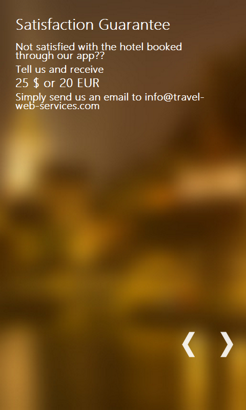 Book your Hotel through your favorite Portal like booking .com and Expedia with our satisfaction Guarantee. What do you get? Money back if not satisfied. Not the entire amount, but more than a consolation prize. If, your hotel turns out to be a disappointment you will receive reimbursement of minimum 20 EUR or $20. How does it work? It's actually pretty simple. For every booking that is generated through our app we receive 2-3% commission from each Hotel Portal. That may not sound like very much per booking, but the key is in the quantity of bookings and that sure adds up fast :-) We combine all the money in one collective pot, which we use to pay your reimbursement. It's similar to Insurance with one small but very important difference, that no one needs to make a deposit. One email to us is all it takes! Info Even though all Portals want you to believe they charge you no Facilitator fee....They still do so! In the end the Hotel has to pay 10-25% to the Facilitator. Our savvy common sense already tells us that Portals have to survive and profit from something!