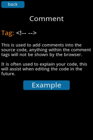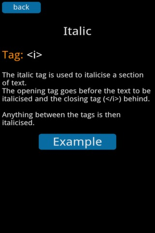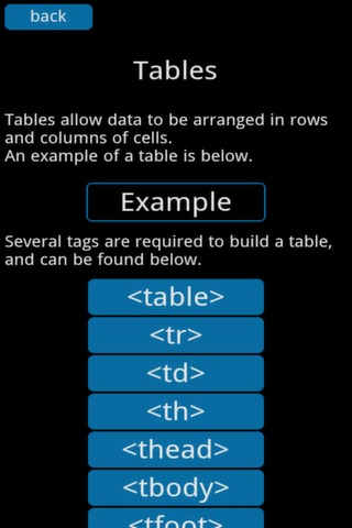HTML Aide is a quick reference app for HTML. For each tag HTML Aide contains: - The tag (and any closing tag) - A description explaining how it's used - A code example of the tag in use - A visual website view of the code example It features: + Over 80 HTML tags including 15 that are new to HTML5. + More in-depth examples of the tags and elements required to build tables and lists. Whether you are just starting out with HTML or a seasoned developer, HTML Aide is the ideal reference. This app runs offline and does not require an internet connection.
