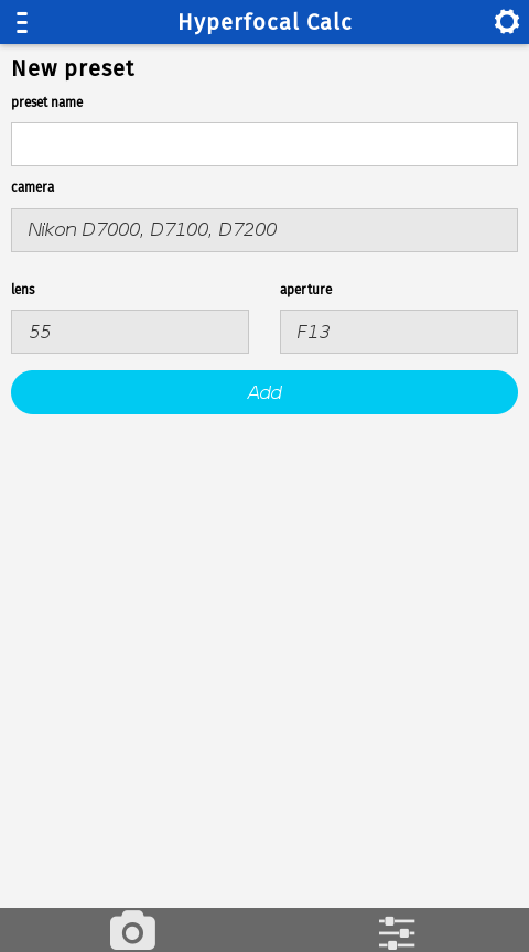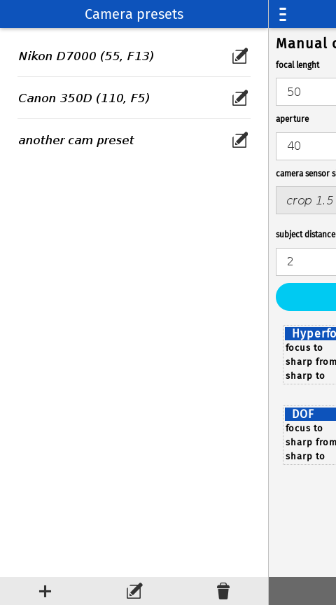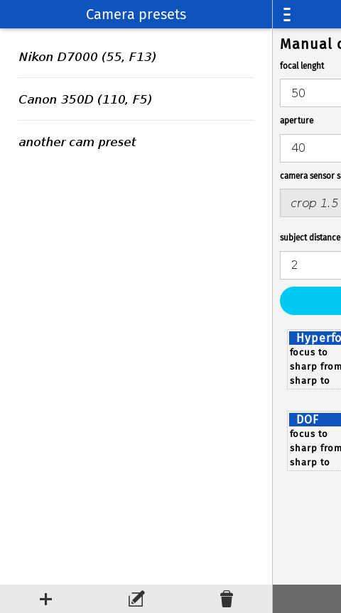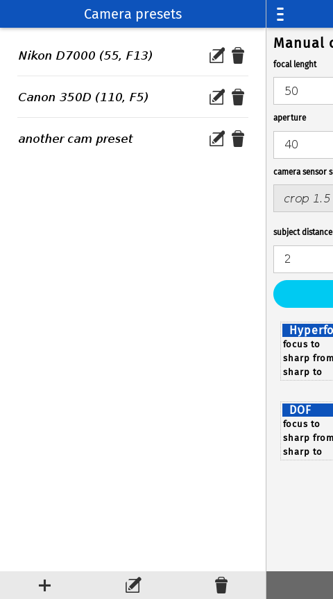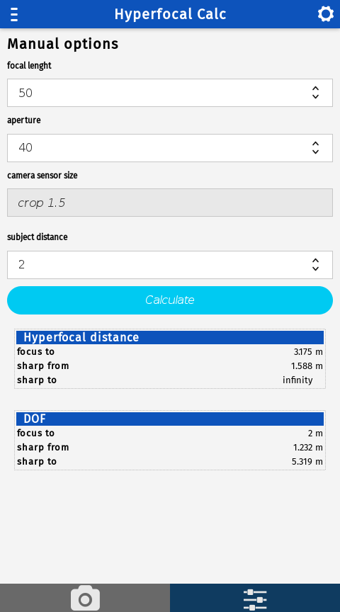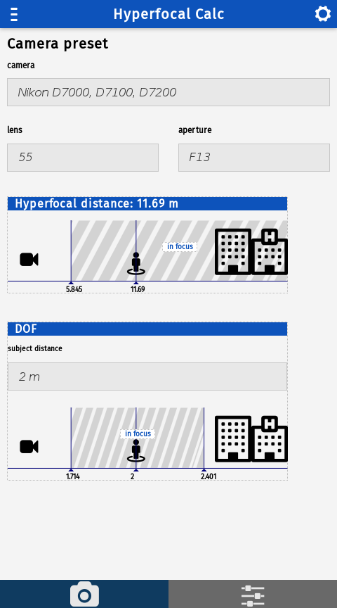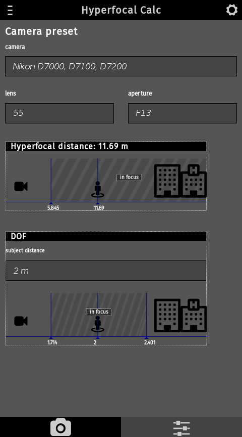 Easy way to calculate hyperfocal distance of your camera release notes: 2.0 - added depth of field - added image view - code cleaning 1.0 - new layout - camera profiles - dark theme - big dispaly support - landscape orientation support - more precise calculation 0.3 - Enable to save camera preset - code cleaning 0.2 - Added localization support. Application is in EN and CS language. 0.1 - base functionality