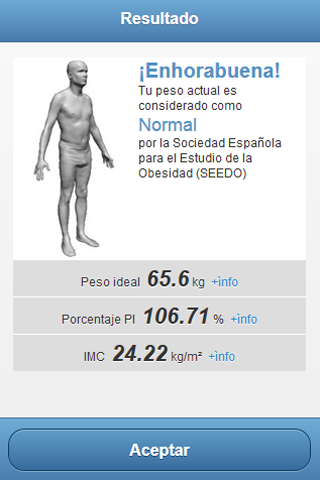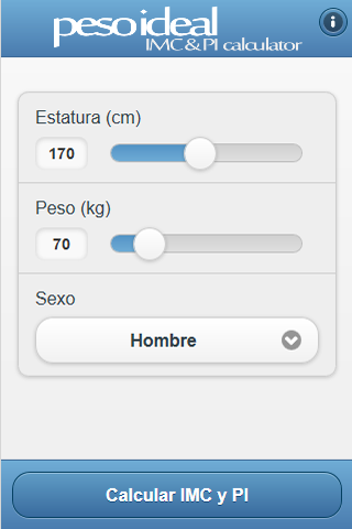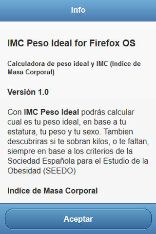 Calculadora de PI (Peso Ideal) e IMC (Indice de Masa Corporal). Controla tu peso fácilmente con tu dispositivo Firefox OS. Con IMC Peso Ideal podrás calcular cual es tu peso ideal, en base a tu estatura, tu peso actual. También podrás calcular tu IMC (Indice de Masa Corporal) y así sabrás si te sobran kilos, o te faltan, siempre en base a los criterios de la Sociedad Española para el Estudio de la Obesidad (SEEDO) Contrala tu peso y mejora tu vida con IMC Peso Ideal para Firefox OS. Características