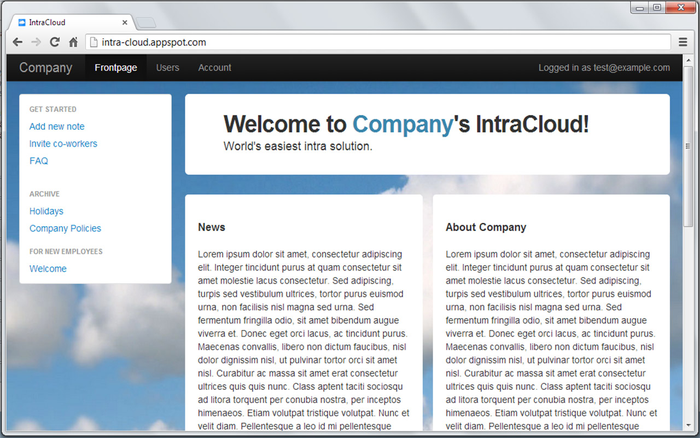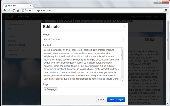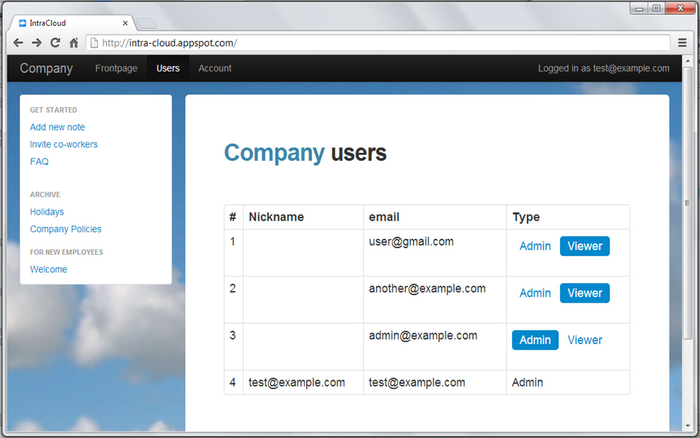 World's easiest intranet solution. FREE for up to 10 users. With IntraCloud-service you can easily put your company's important information accessible to your every employee. IntraCloud is super simple to use and there is none of not-so-important features. If you have some information to share just click 'Add new note', write content and click 'Add note' and that's it, your new note is shared to your employees instantly. IntraCloud is not for spamming and all the information can be accessed only via IntraCloud service (with PC, tablet or mobile phone) and only by persons who are allowed to log in. All the information you put to the service is secured with your google account. (IntraCloud is still in beta-stage so if you have any problems please contact [email protected])