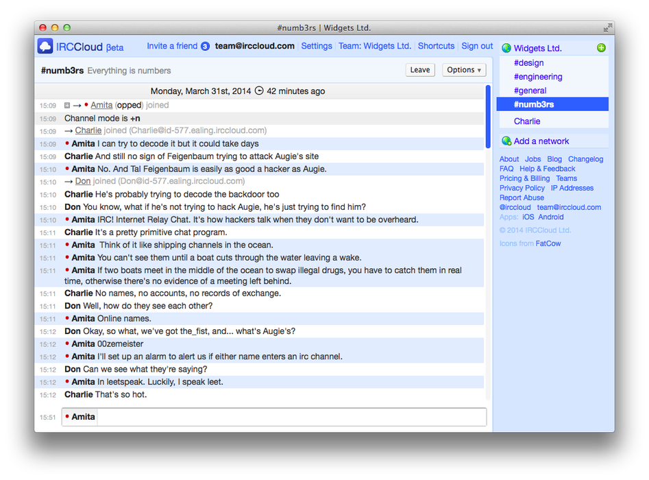 Group chat for teams, friends, and communities. IRCCloud is an IRC client with a future. Stay connected, chat from anywhere, and never miss a message.