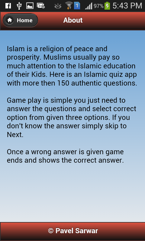 Islamic quiz app for Muslim Kids. Islam is a religion of peace and prosperity. Muslims usually pay so much attention to the Islamic education of their Kids. Here is an Islamic quiz app with more then 150 authentic questions. Game play is simple you just need to answer the questions and select correct option from given four options. If you don't know the answer simply skip to Next. Once a wrong answer is given game ends and shows the correct answer.