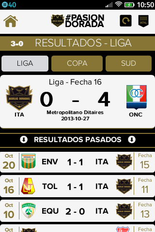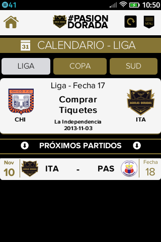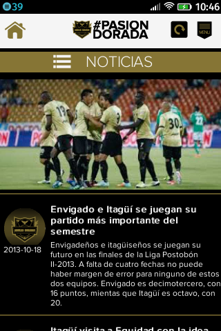 Aplicación de las águilas doradas del fútbol colombiano ¡Creada por hinchas para hinchas! Esta versión de la aplicación del Itagüí Fútbol Club te permitirá encontrar de manera rápida, ágil y sin rodeos, toda la información que necesitas saber de las águilas doradas de Antioquia. Comparte a través de tus redes sociales, el orgullo de ser hincha del cuadro itagüiceño, utilizando la etiqueta #PasiónDorada En esta aplicación podrás encontrar: • Noticias cortas y concretas sobre el presente del club • Resultados actualizados en tiempo real. • Estadísticas y tablas de posiciones de todos los torneos en los que el club se encuentra participando. • Calendarios con la información actualizada sobre los partidos que el club esté por enfrentar, en todos los torneos en los que se encuentre participando. • Información minuto a minuto de los partidos del club, con actualizaciones sobre todo lo que va aconteciendo en el campo, ¡EN TIEMPO REAL! • Información actualizada sobre el plantel profesional del club (posición, lugar y fecha de nacimiento, estatura, peso, etc). ¡Conoce y ten a la mano la lista de jugadores e ídolos que lo hacen grande! • Acceso directo a las redes sociales oficiales del club, donde podrás interactuar con otros hinchas como tu.