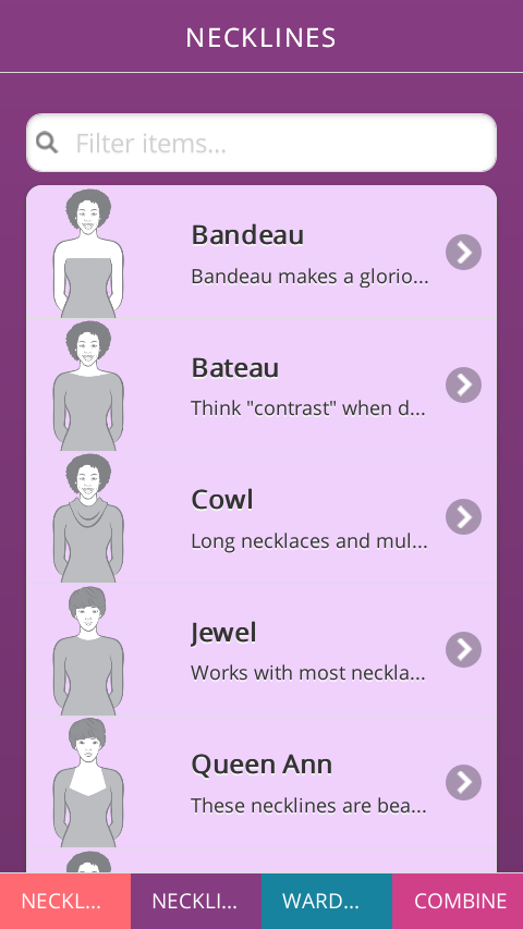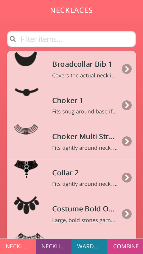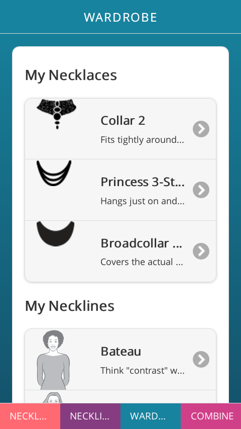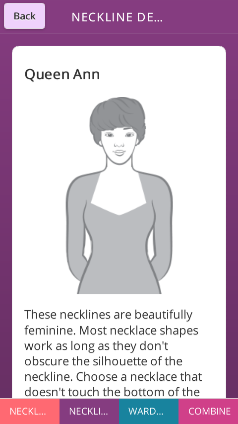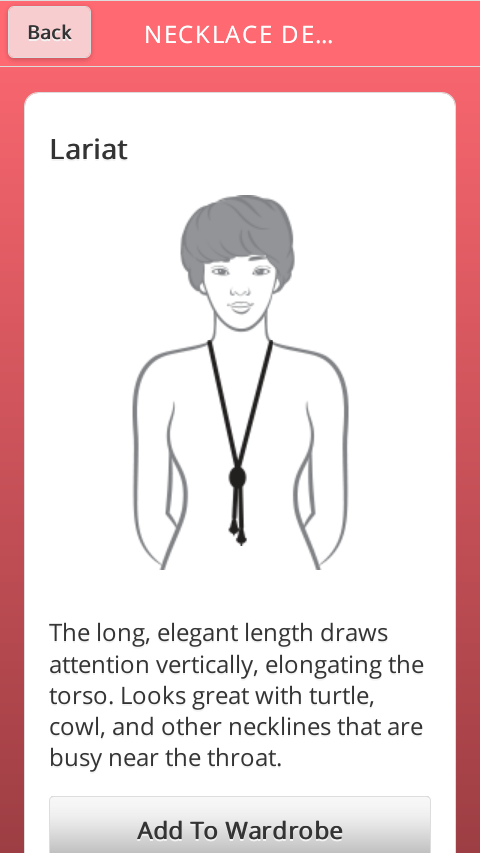 Jewelry Maven helps jewelry designers and wearers coordinate jewelry styles and clothing combinations. Discover a variety of necklaces and necklines, add them to your virtual wardrobe, and combine them to see what works and what doesn't. Over twenty necklace styles and ten neckline styles allow hundreds of combinations and ratings.