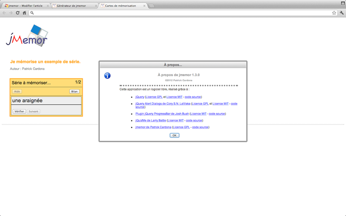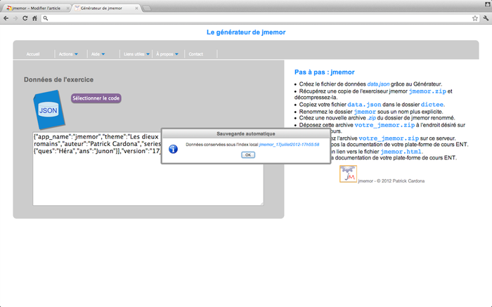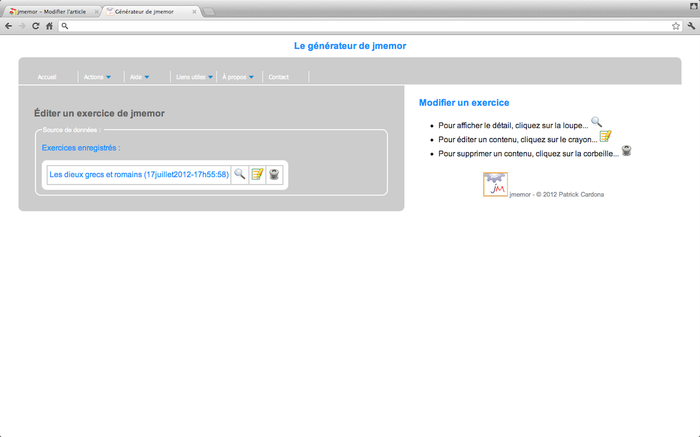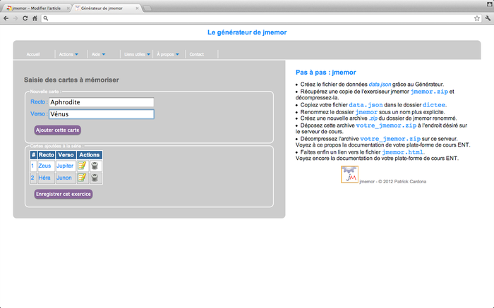 Le générateur de JMemor permet de créer des séries de paires associatives à mémoriser (flashcards) ainsi que le quiz associé à la même série. D'abord, vous devez saisir une nouvelle série de cartes ou paires associatives. Par exemple, au recto, le nom grec d'un dieu de la mythologie, au verso, son nom romain, etc. Ensuite, grâce au fichier de données créé par le générateur, vous devez publier l'exerciseur complété par ce fichier sur un serveur de cours. Une fois votre exerciseur publié sur le serveur : - Pour exécuter l'activité de mémorisation, faites un lien vers le fichier JFC.html. - Pour exécuter le quiz correspondant, faites un lien vers le fichier Test.html. Vous trouverez une aide contextuelle pendant l'exécution du générateur.