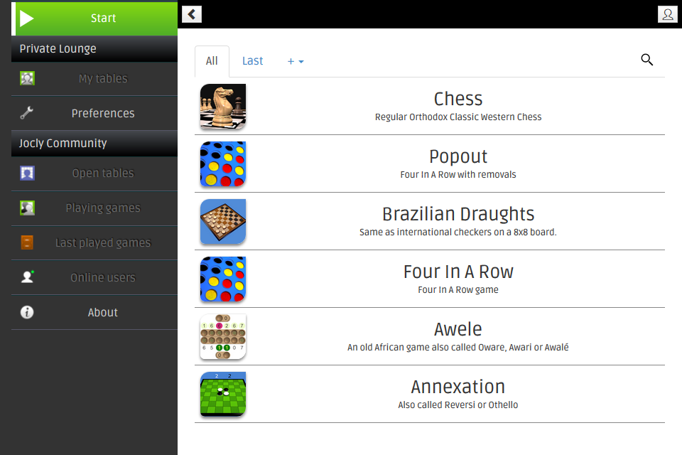 A few classic games by Jocly This application game set features: - Chess - Draughts (8x8) - Awele - Connect 4 (plus Popout variant) - Reversi