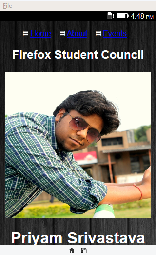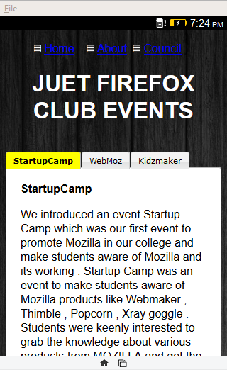 This is a web app for App Of the Month contest . December theme. App to aware web about JUET FIREFOX CLUB and its functioning along with its members. #firefoxstudents , #mozilla , #appmaker , #thimble , #firefox