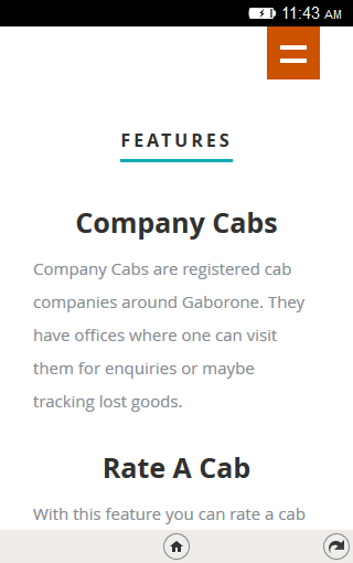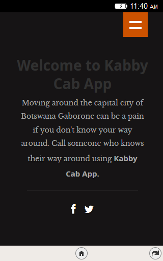 Kabby Cab is an app designed for convinience. Most of the time if not, people always ask each other for cab numbers, they either spend too much airtime calling all their friends, also they may or may not get the cab numbers at the end of the call. With Kabby Cab, we bring you a centralized repository of Registered Cab Companies in Gaborone.
