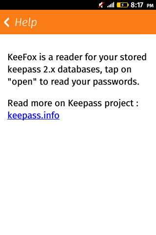 A Keepass kdbx file reader. for more info on keepass : http://keepass.info/ This app support only keepass 2.x EDIT: there are several issue on Mozilla Flame or your db file is too big