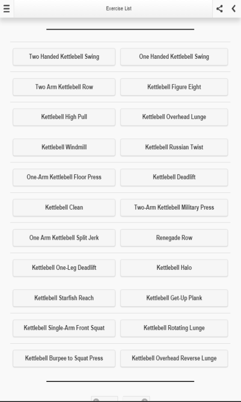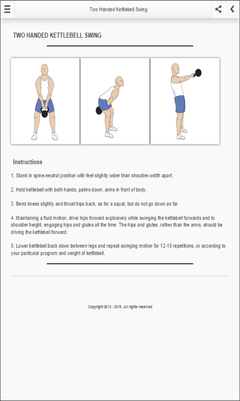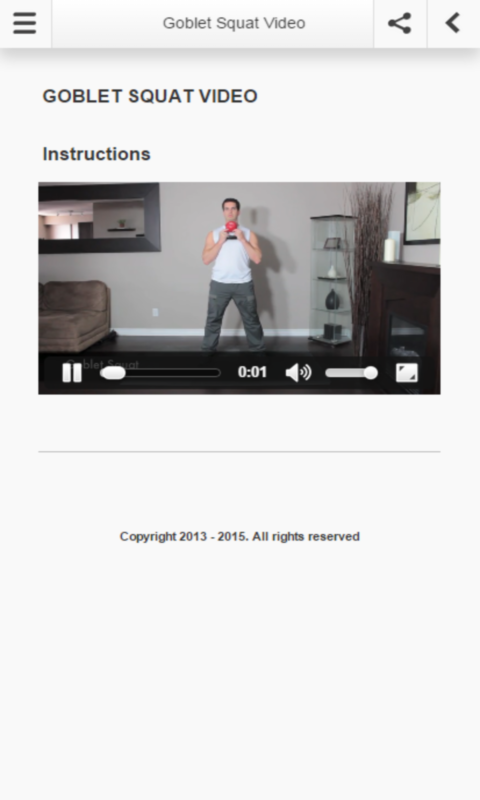 This app contains a variety of kettlebell related exercises and videos. All exercises have detailed instructions and images, there are also sample workouts and challenges and some basic information included.