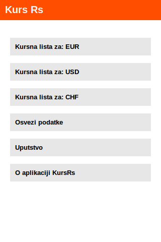 Application KursRs enables you to have the most recent currency exchange rates from portal kurs.rs. Portal www.kurs.rs gives you the most recent buy and sell rates for great number of exchange offices and bank, lets you calculate how much would you get for buying or selling for in a given exchange office or bank as well as their location in Serbia. Portal www.kurs.rs was developed by Vlada Grujic. Application for FirefoxOs was developed by Ivan Dejanovic (www.quineinteractive.com). Aplikacija KursRs vam omogucava da na svom telefonu imate najsvezije kursne informacije sa portala kurs.rs. Portal www.kurs.rs vam omogucava da saznate najsvezije prodajne i kupovne kurseve za veliki broj menjacnica i banaka, da izracunate koliko bi vas kostala kupovina ili prodaja u izabranoj menjacnici ili banci kao i da saznate lokacije ekspozitura za izabranu menjacnicu ili banku u Srbiji. Portal www.kurs.rs razvio je Vlada Grujic. Aplikaciju za FirefoxOs razvio je Ivan Dejanovic (www.quineinteractive.com).
