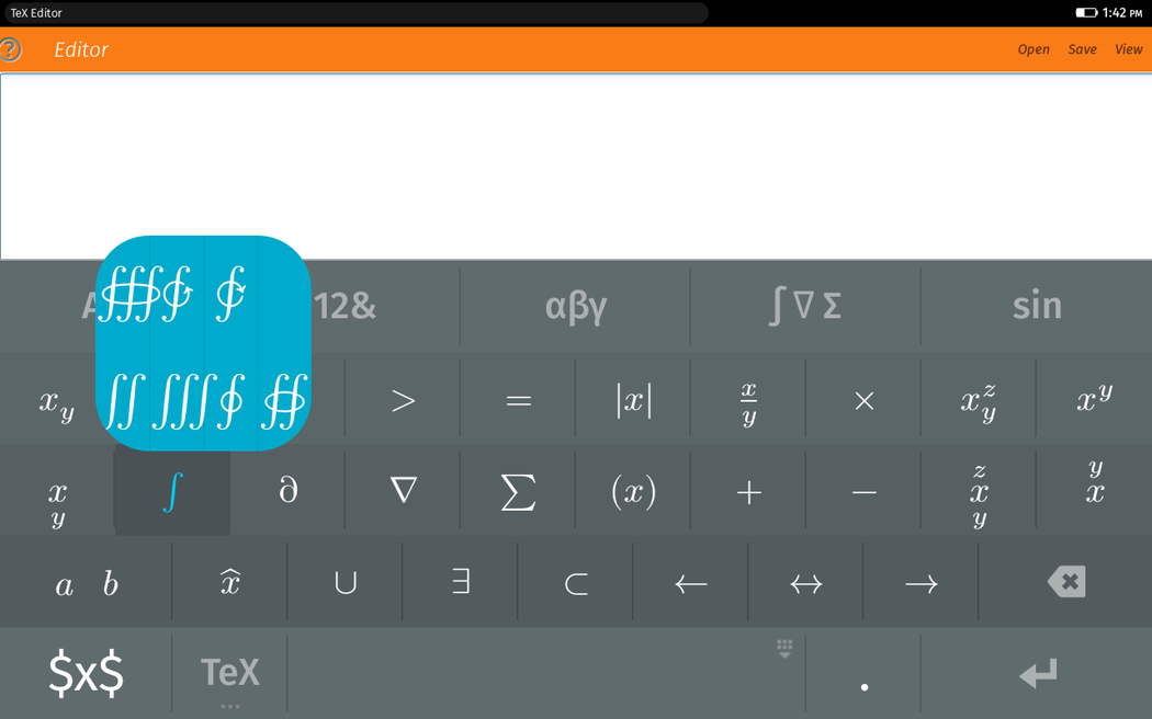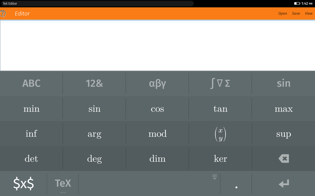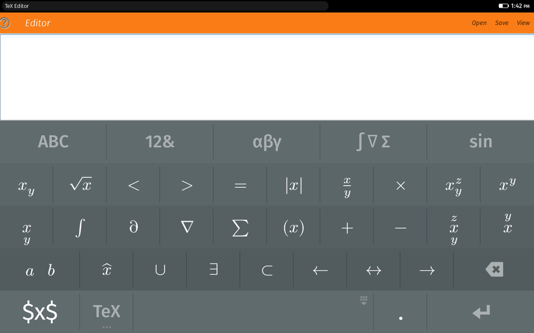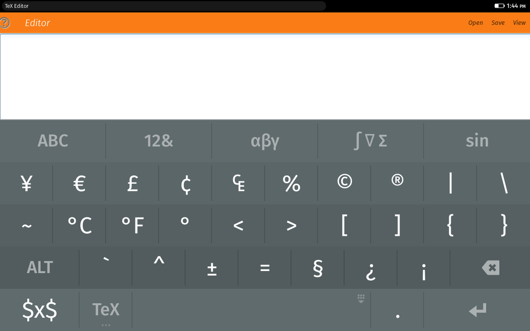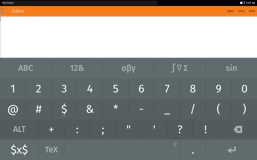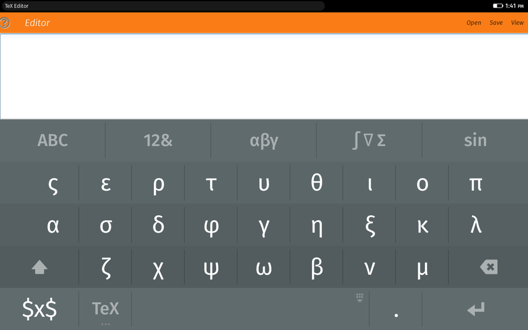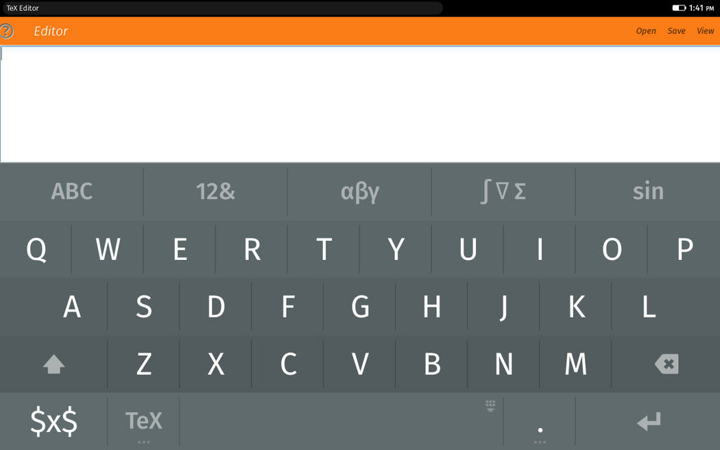 Keyboard with keys to input (La)TeX code for math symbols. This is only a keyboard. If you want to preview the typed (La)TeX code you will need another app that do this or use the web browser to access one online service that do that. This app ONLY works for devices using Firefox OS 2.0 or greater. It will NOT work on older versions of Firefox OS. Some keys of this keyboard NEED font that support math symbols which isn't available at Firefox OS devices. You can use the keyboard without the fonts but sometimes will see a rectangle in the place of the key.